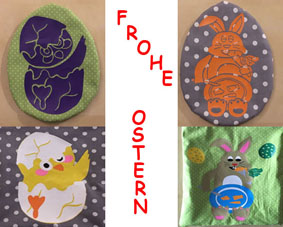 Der Hase Jamie und das Küken Marla lassen sich vielseitig zu Ostern verwenden. Auf Kissen, Taschen oder Karten sind sie schön anzusehen. Das Motiv kann jeweils in einer Farbe oder mehrfarbig gestaltet werden.